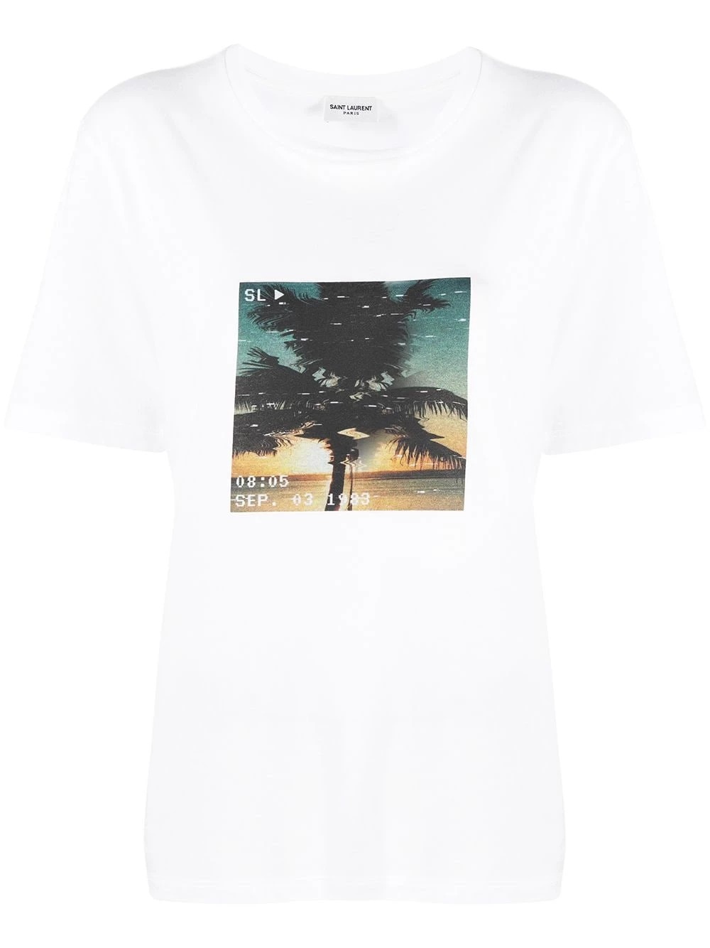 Switch up your basics collection. Crafted from white cotton, this short-sleeve T-shirt from Saint Laurent is finished with a bold graphic print of a palm tree across the chest. Not your average tee.