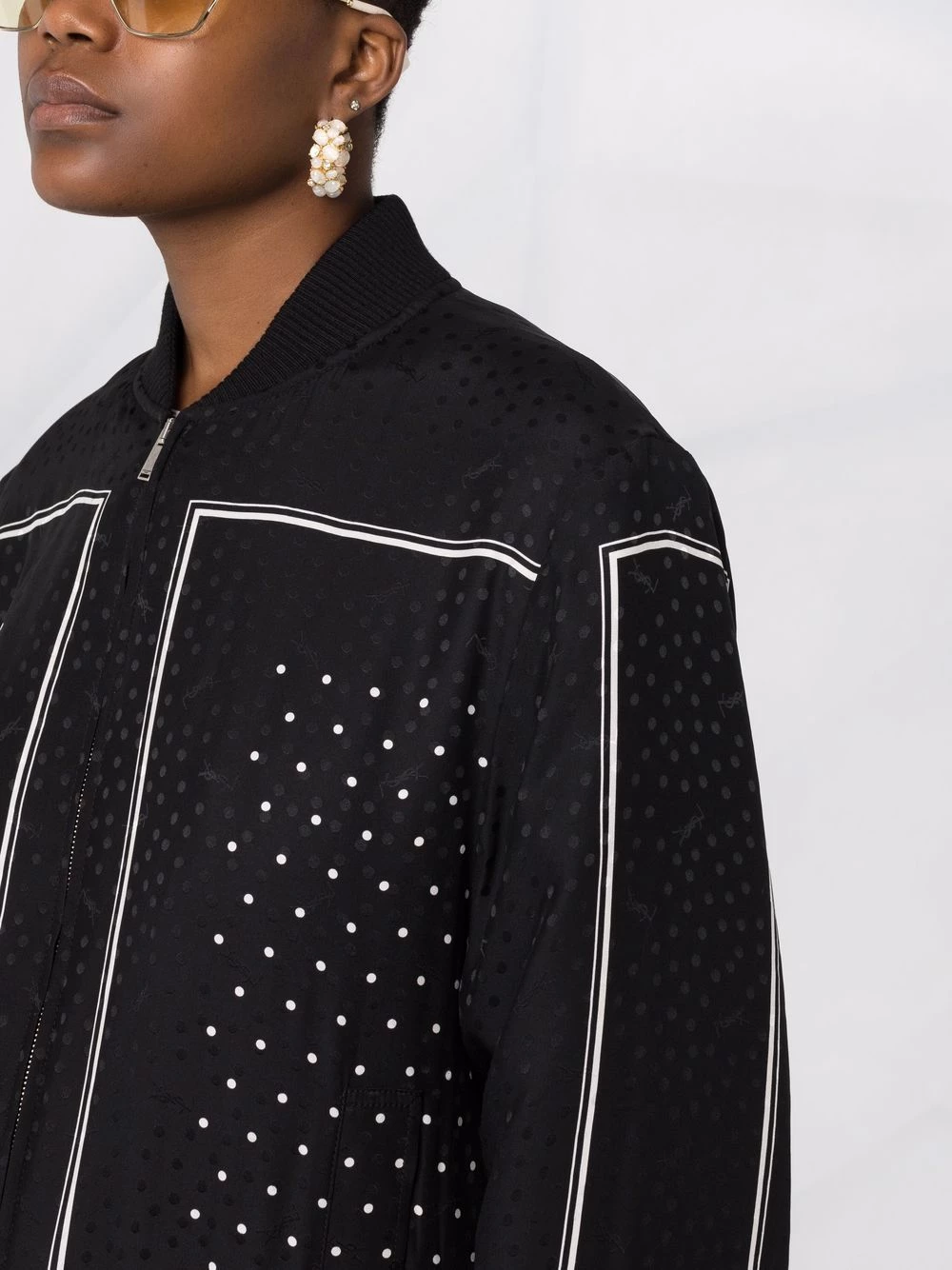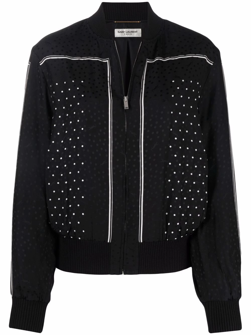 Established in 1961, Saint Laurent’s craftsmanship and attention to detail is seen throughout their pieces, including this bomber jacket. Cut from silk and wool, this piece is decorated with a mash-up of polka dots and a monogram pattern.ย