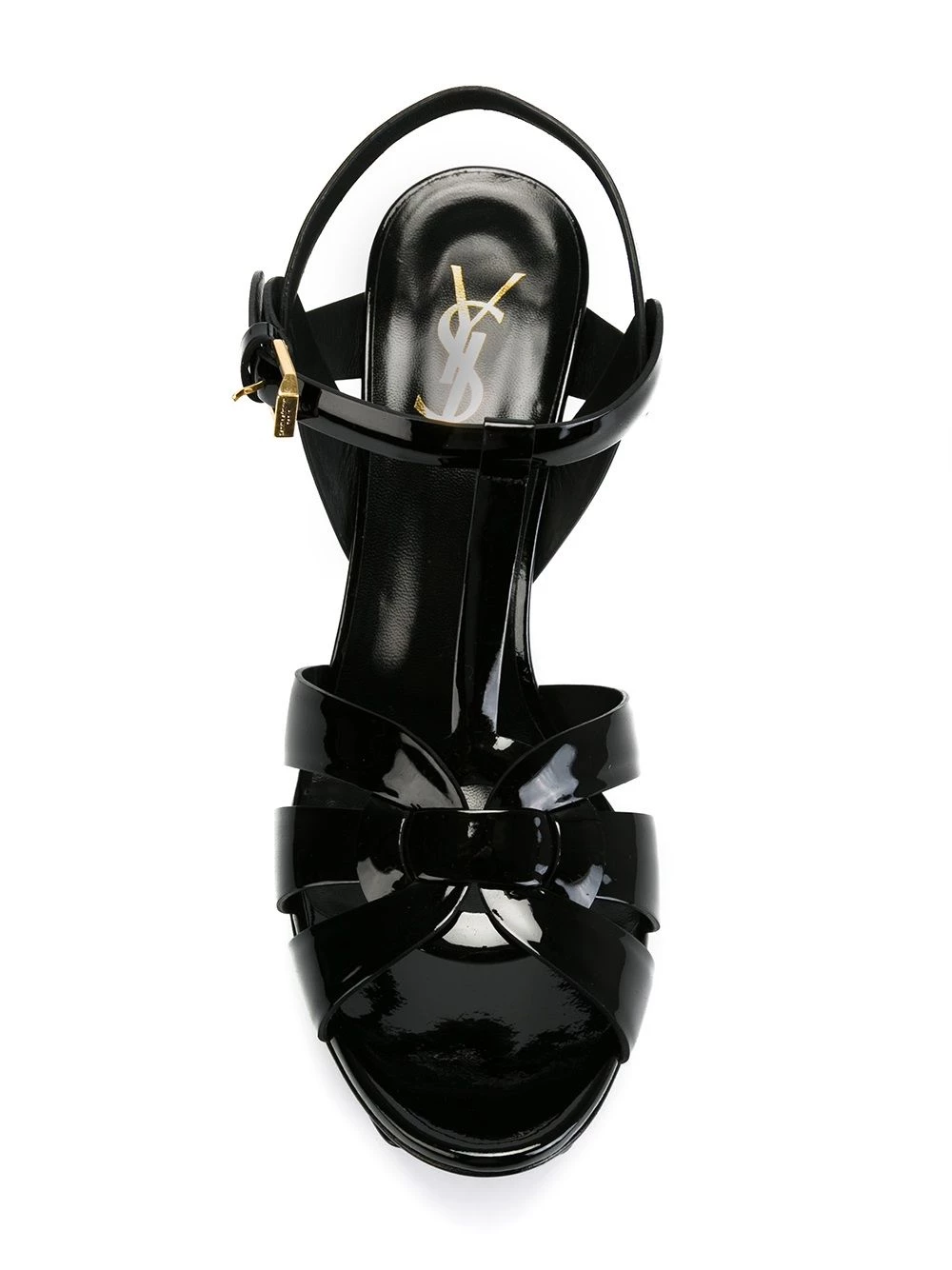 Reach for new heights with Saint Laurent. Made from black patent leather, these Tribute 100mm sandals are a classic, with a platform at the front to make strutting your stuff a little easier. Put your best foot forward. Featuring an open toe, a t-bar strap, an ankle strap with a side buckle fastening, a branded insole, a platform sole and a high stiletto heel.
