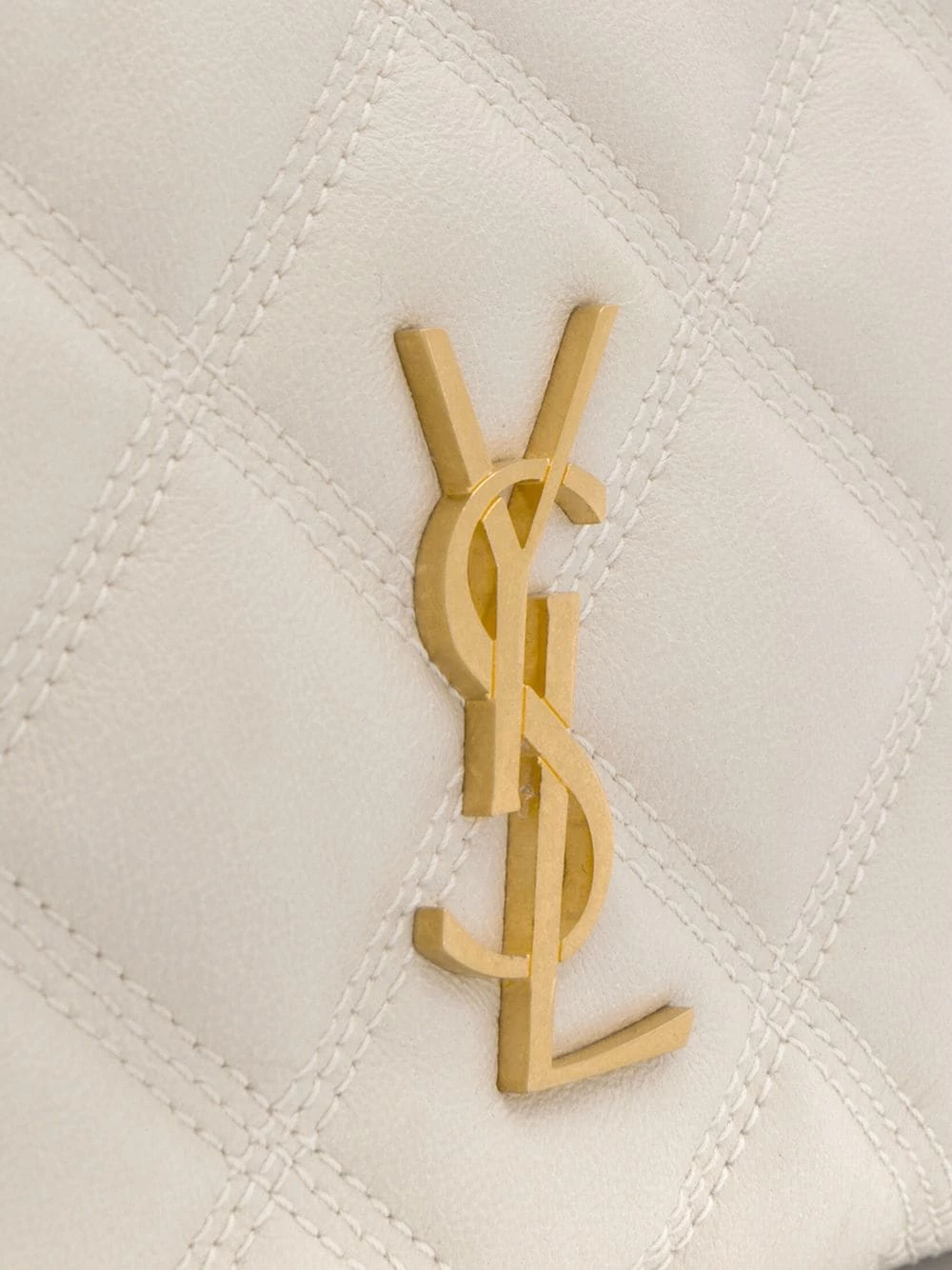 Synonymous with youth and modernity, luxury fashion house Saint Laurent was originally founded in 1961 by Algerian-born French couturier Yves Saint Laurent, like this soft cream lambskin Becky mini bag. Featuring a double top zip closure, gold-tone hardware, multiple interior card slots, an internal logo patch, a chain and leather shoulder strap and a YSL metal appliqué on the front.