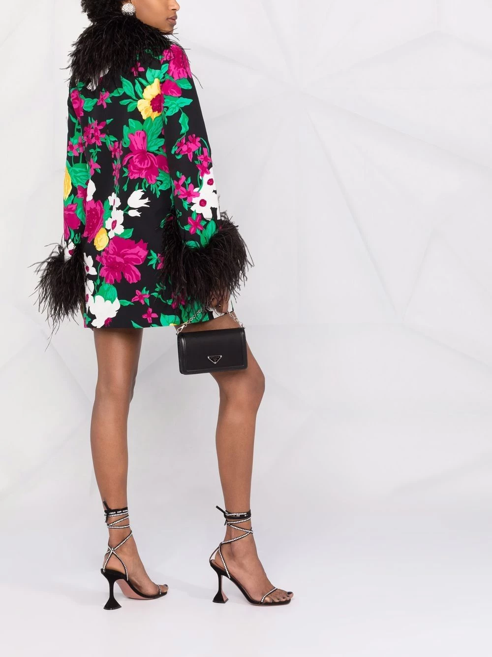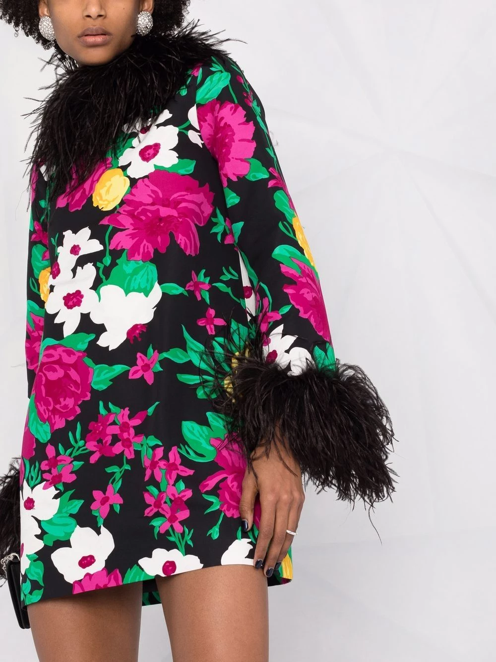 That’s one way to make a style statement at the next cocktail party you’re invited to. From the all-over floral print to the wispy feather trim, you’ll no doubt steal the show. Be bold.