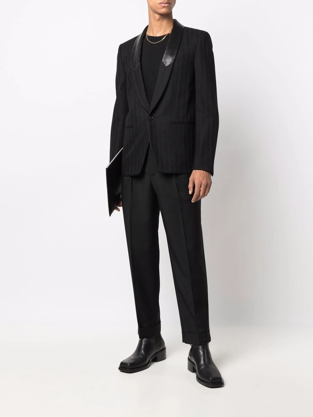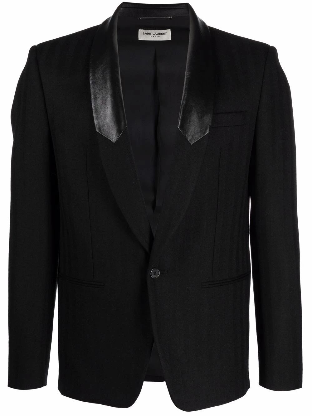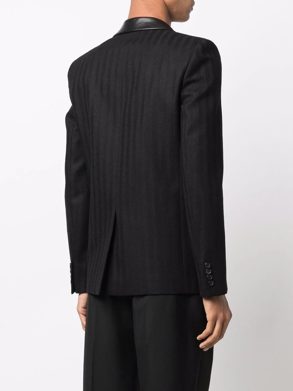 With a penchant for elevating classic staples with a rock ‘n’ roll attitude, Saint Laurent presents this virgin wool blazer for their AW21 collection. Cut for a traditional tailored fit, it is adorned with leather detailing on the shawl lapels and an all-over raised stripes pattern.