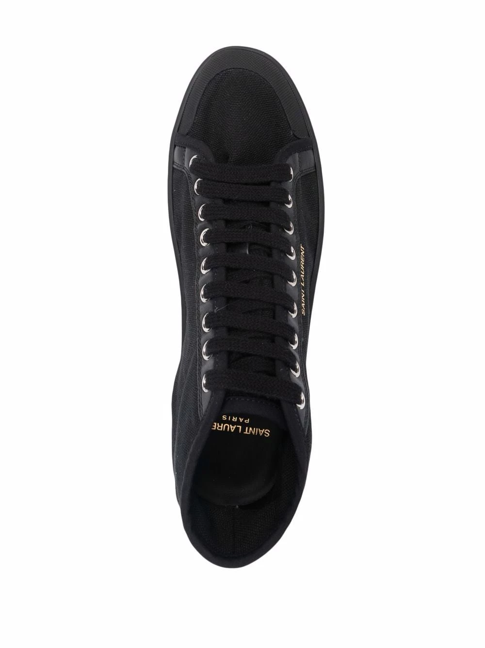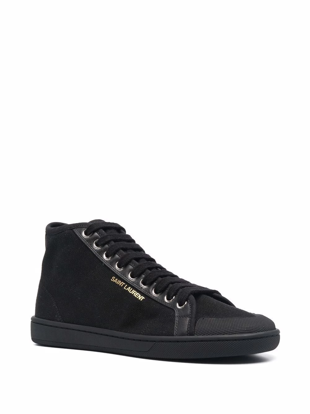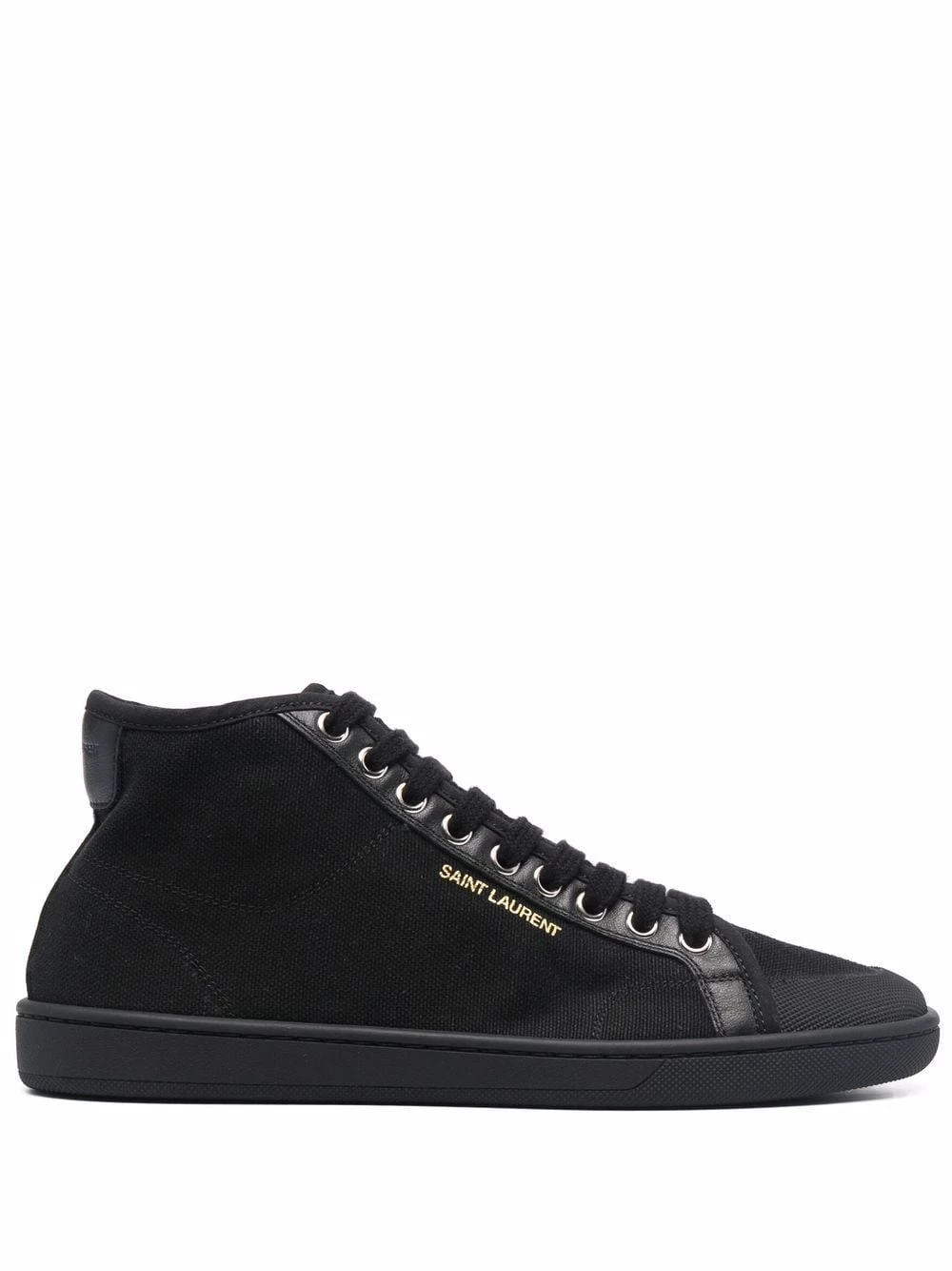 Saint Laurent’s mid-top lace-up sneakers are made from off black cotton with a contrasting rubber sole and toecap. These shoes are finished with a gold-tone logo stamp towards the side.