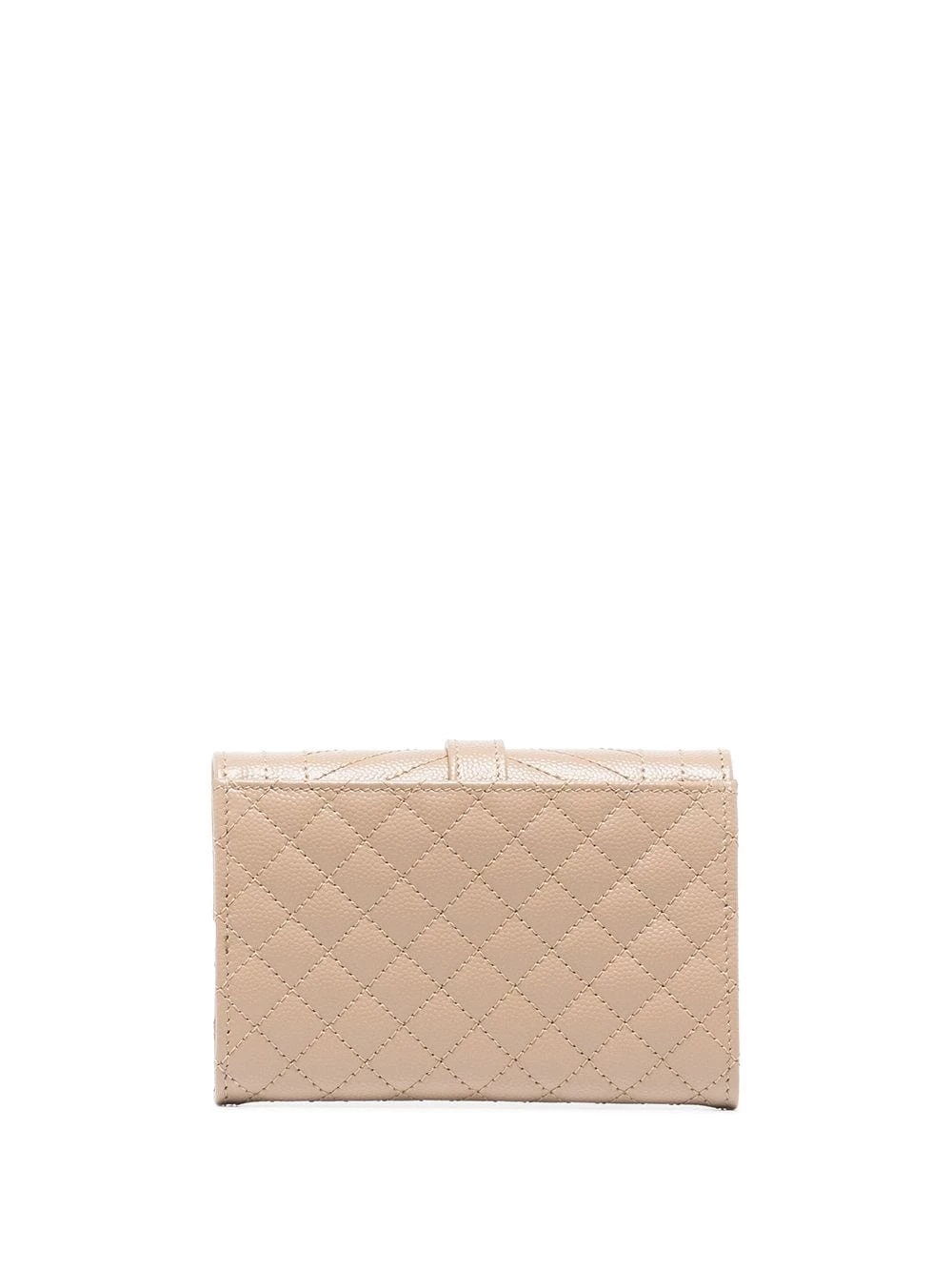 Quintessentially Saint Laurent, this envelope wallet boasts a classic YSL monogram plaque at the front and a diamond quilt effect. Crafted from soft leather in a versatile beige colour, this elegant accessory is finished with a foldover top and fastens with a press-stud closure.
