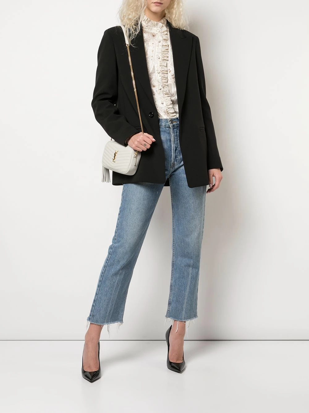 If you can’t beat them, join them. That’s what I say to my girl friends when they tell me to buy another bag. Case on point: this white leather Lou camera bag from Saint Laurent. Oh my, oh my. Featuring gold-tone hardware, a top zip closure, a hanging tassel, a back slip pocket, a main internal compartment, a chain and leather shoulder strap and a YSL metal appliqué on the front.