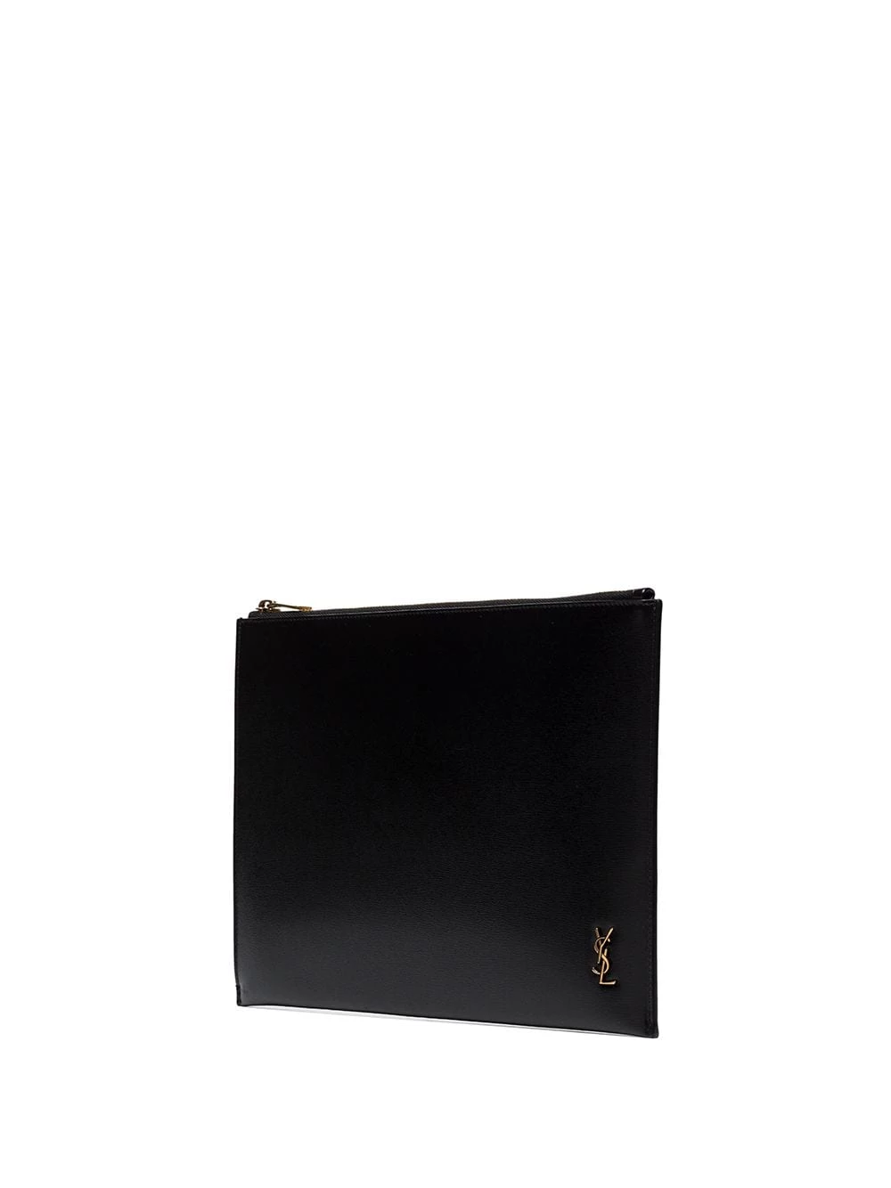 Juggling too many things with your hands? Saint Laurent can help out with this black leather Monogram pouch bag that has a sleek design with its smooth surface with a matte finish. Grab this beauty today. Featuring a top zip closure and an internal logo patch.