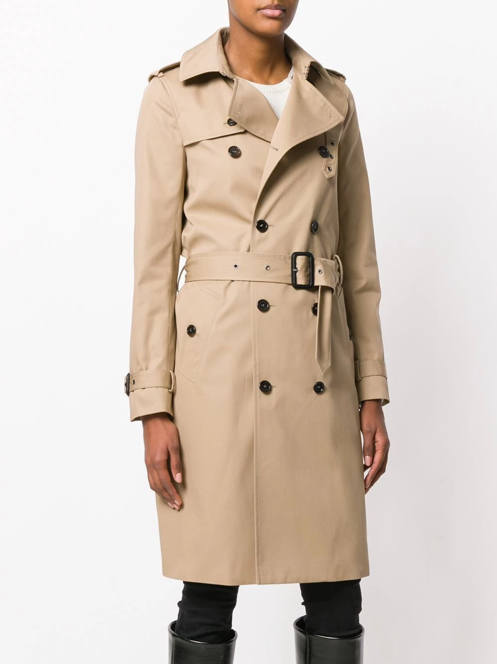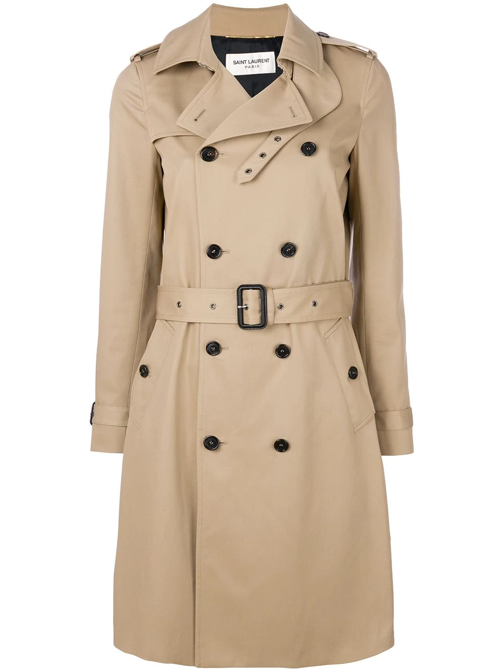 Designed with functionality and style in mind, this classic Saint Laurent trench coat showcases the expert Parisian design that made the label’s iconic Le Smoking suit a cult classic. Fashioned in Italy from beige cotton and lined with a soft cotton blend, this Saint Laurent trench coat depicts a classic silhouette complete with epaulettes at the shoulders, a buttoned gun flap and rear storm flap, a double breasted front fastening, two side buttoned pockets, long sleeves with buckle strap cuffs and a rear central vent. Cinched with an adjustable belt fastening at the waist; this elegant outerwear option benefits from logo engraved buttons and a smooth black leather covered belt buckle.