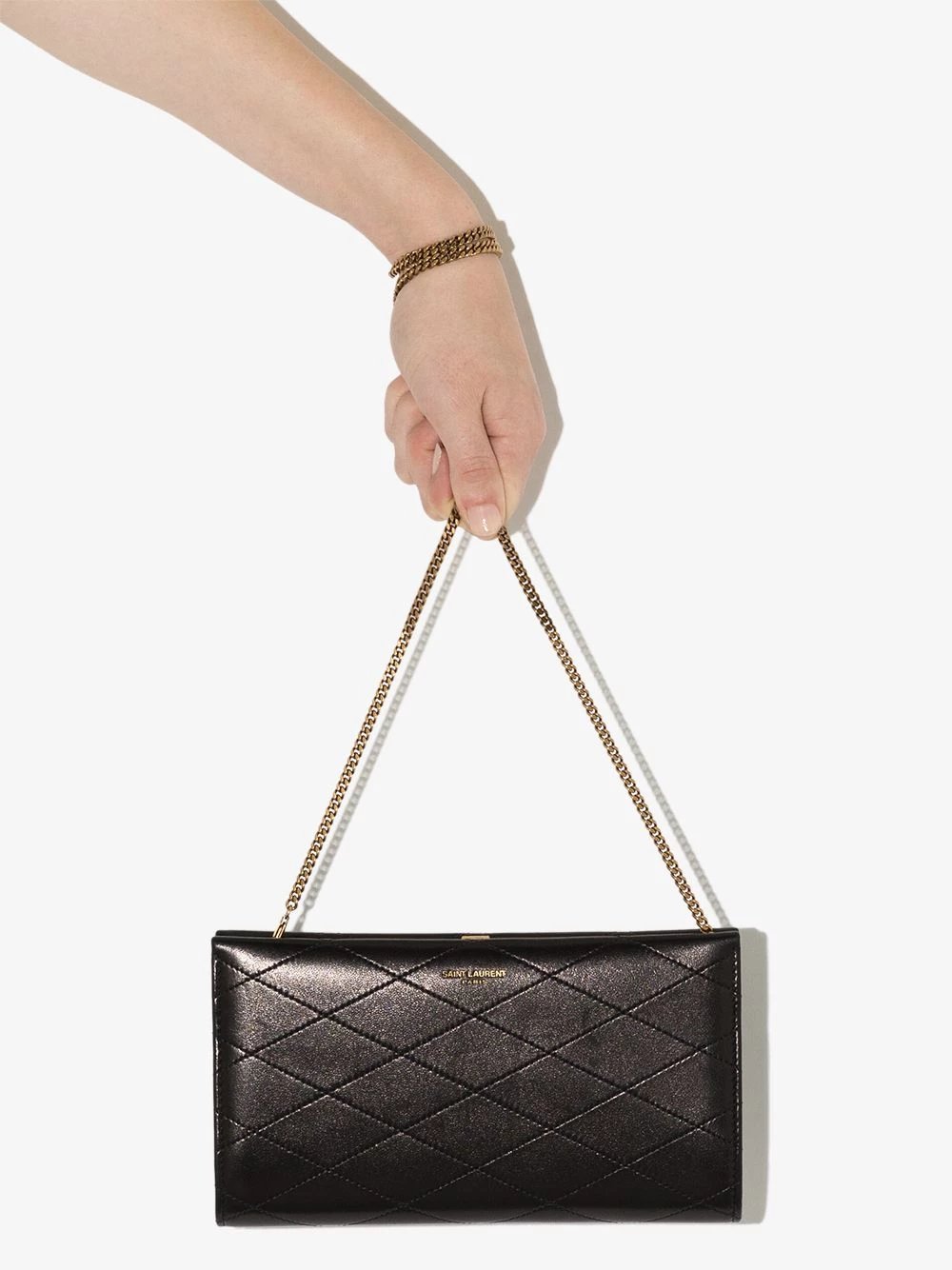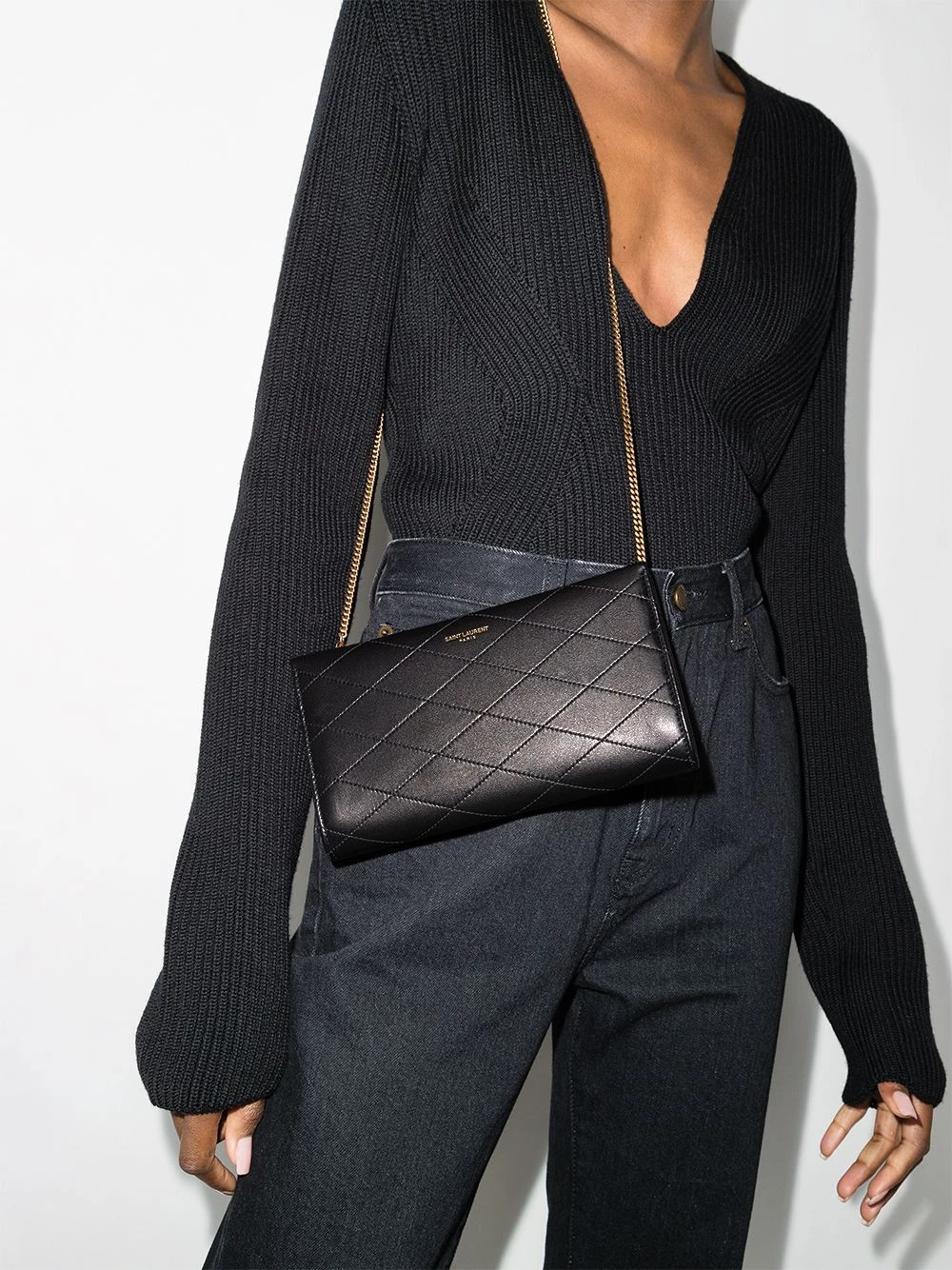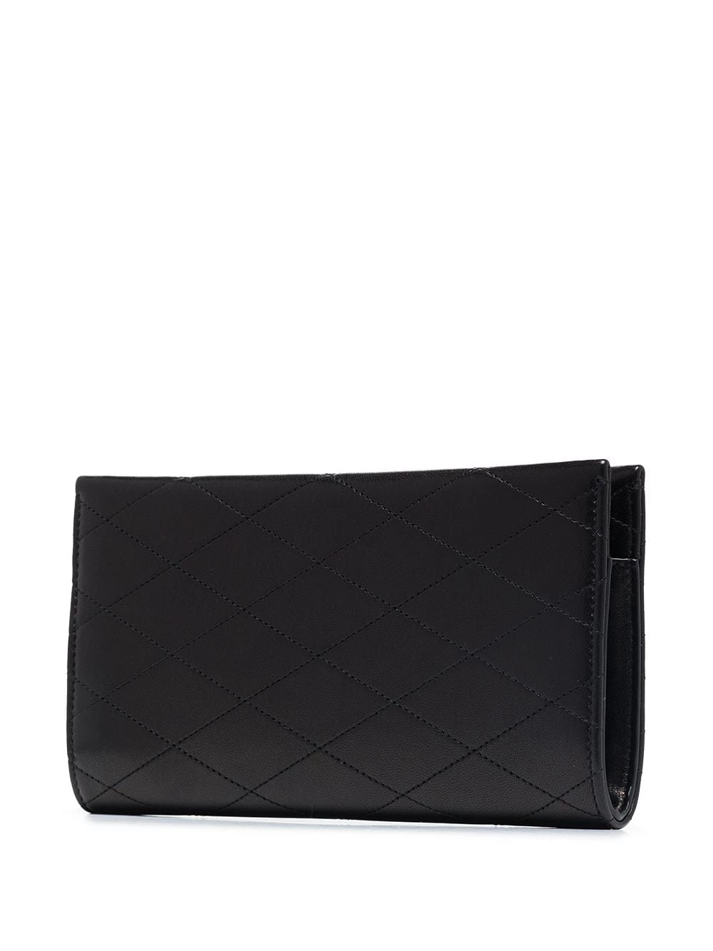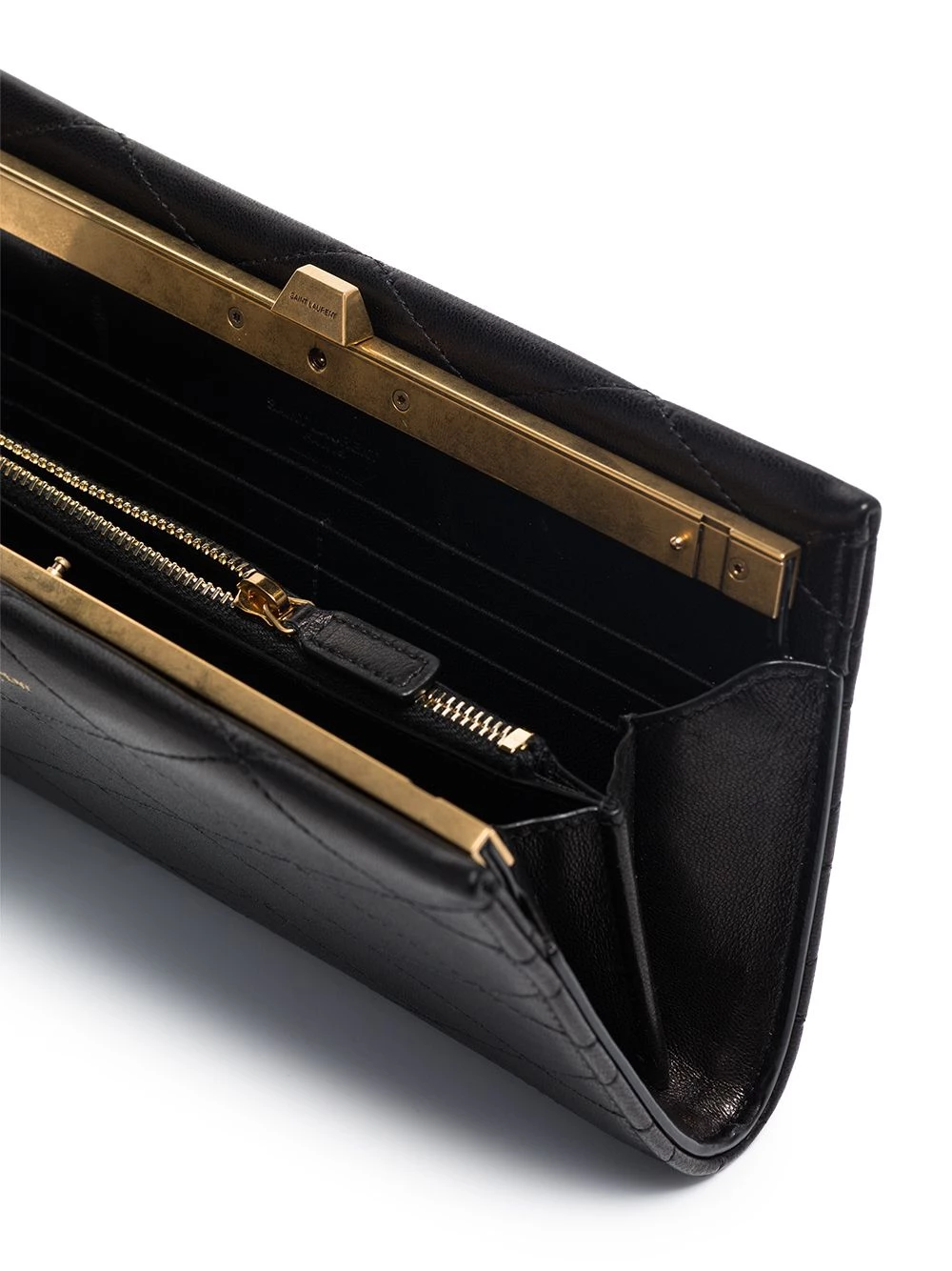 Saint Laurent’s signature sleek design style is showcased in this clasp-fastening wallet through refined detailing such as a logo stamp at the front and tonal stitching in diamond shapes across the front and back of the design.