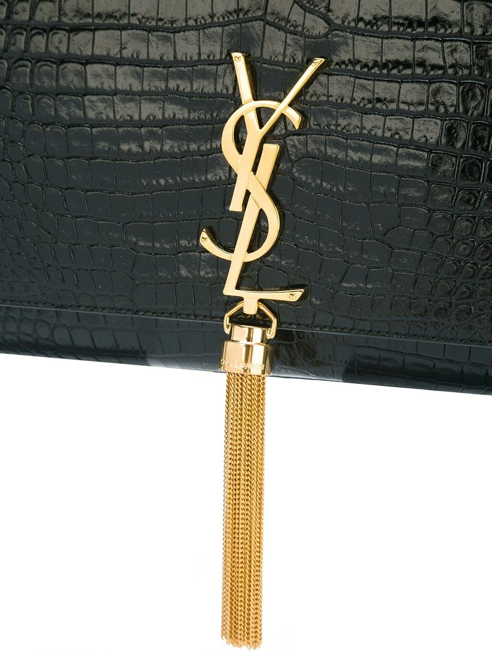 Time to greet your new bestie. This medium Monogram Kate shoulder bag from Saint Laurent vows to be there for you through thick and thin……well, through every shopping trip. And isn’t that what BFFs are for? Featuring a chain shoulder strap, an embossed crocodile effect, a front logo plaque, a hanging tassel, gold-tone hardware, a foldover top with magnetic closure, an internal logo stamp, an internal slip pocket and an internal logo plaque.
