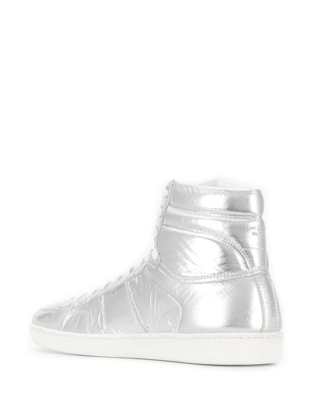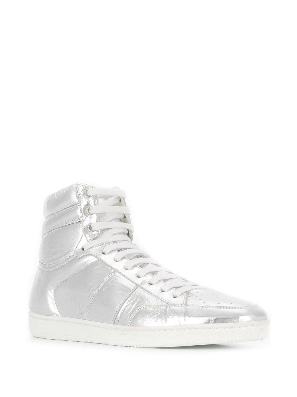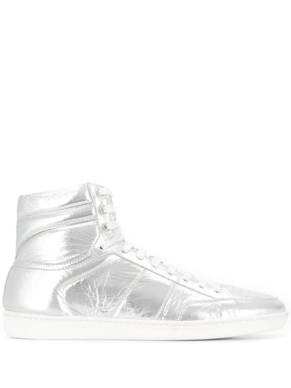 Established in 1961 by Yves Saint Laurent, French fashion house Saint Laurent is coveted for its quintessential Parisian aesthetic. Showcasing adept craftsmanship alongside luxury fabrics and expert design; the beloved label remains a cult classic with every season, as seen in these metallic grey leather padded hi-top sneakers from Saint Laurent featuring a lace-up front fastening, a round toe, a rubber sole and an embossed logo to the rear.